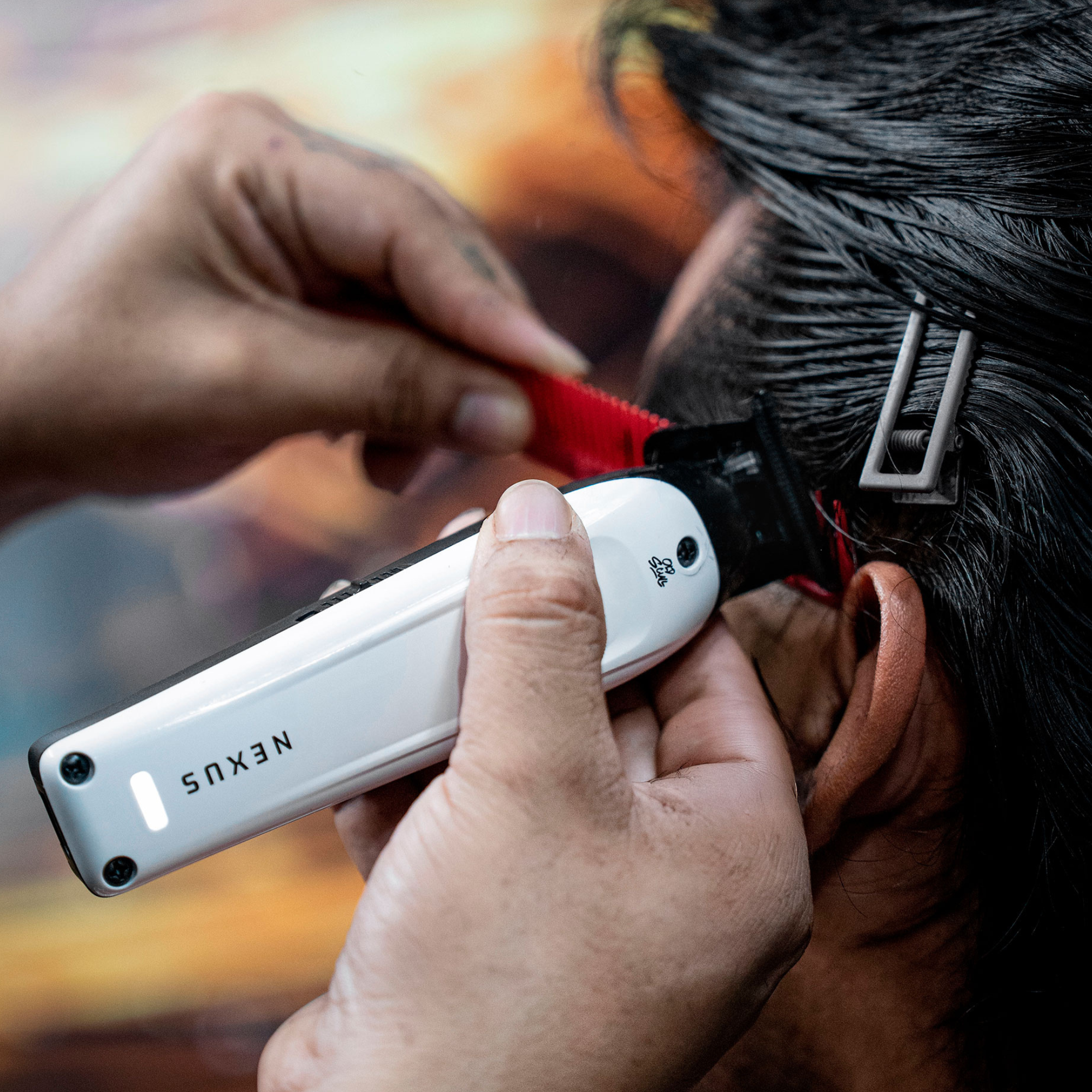 La pieza central es la Nexus Clipper, que ahora viene en un vibrante color rojo. Equipada con un potente Motor Carbon Brush de 7000 rpm y cuchillas de DLC + Acero inoxidable, esta máquina te permite crear desvanecidos y cortes precisos sin esfuerzo. Su batería de litio de 2600mAh te da hasta 3 horas de uso con una sola carga, y sus 6 peines magnéticos facilitan los cambios, haciendo tu trabajo más fluido y eficiente.